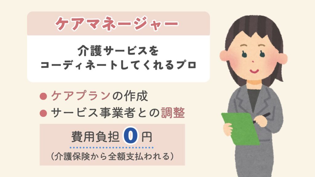 ひとことで言えば、「介護サービスをコーディネートしてくれるプロ」。直接介護をするわけではありませんが、どんなサービスをどう使うかを一緒に考えてくれる、介護生活の要となる存在です。