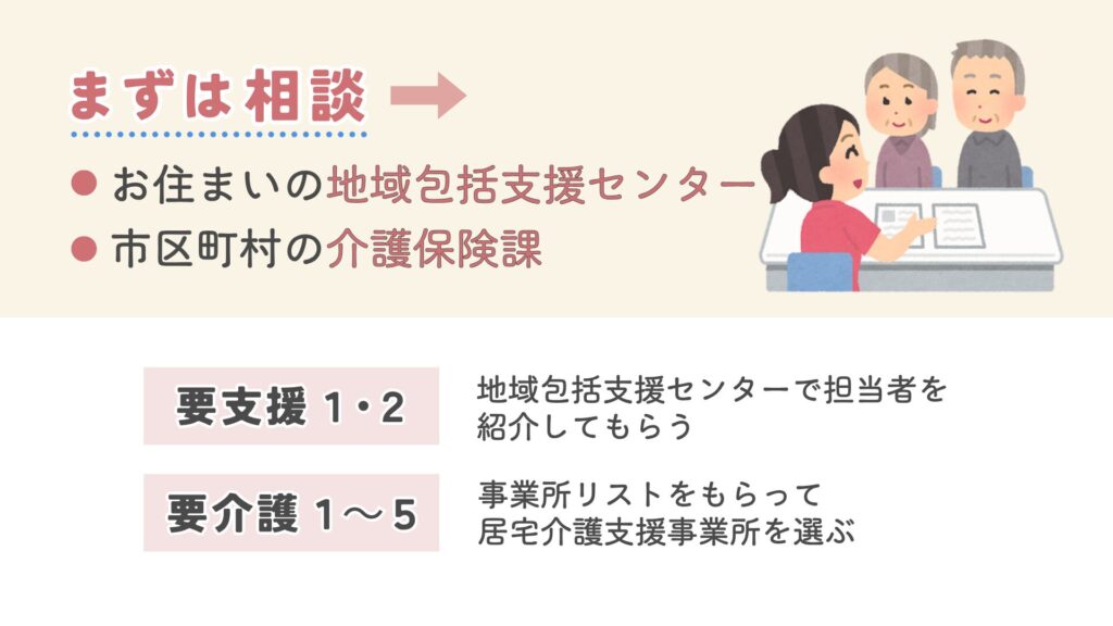 どちらの場合も、まず地域包括支援センターか市区町村の介護保険課に足を運んでみてください。居宅介護支援事業所のリストをもらえます。