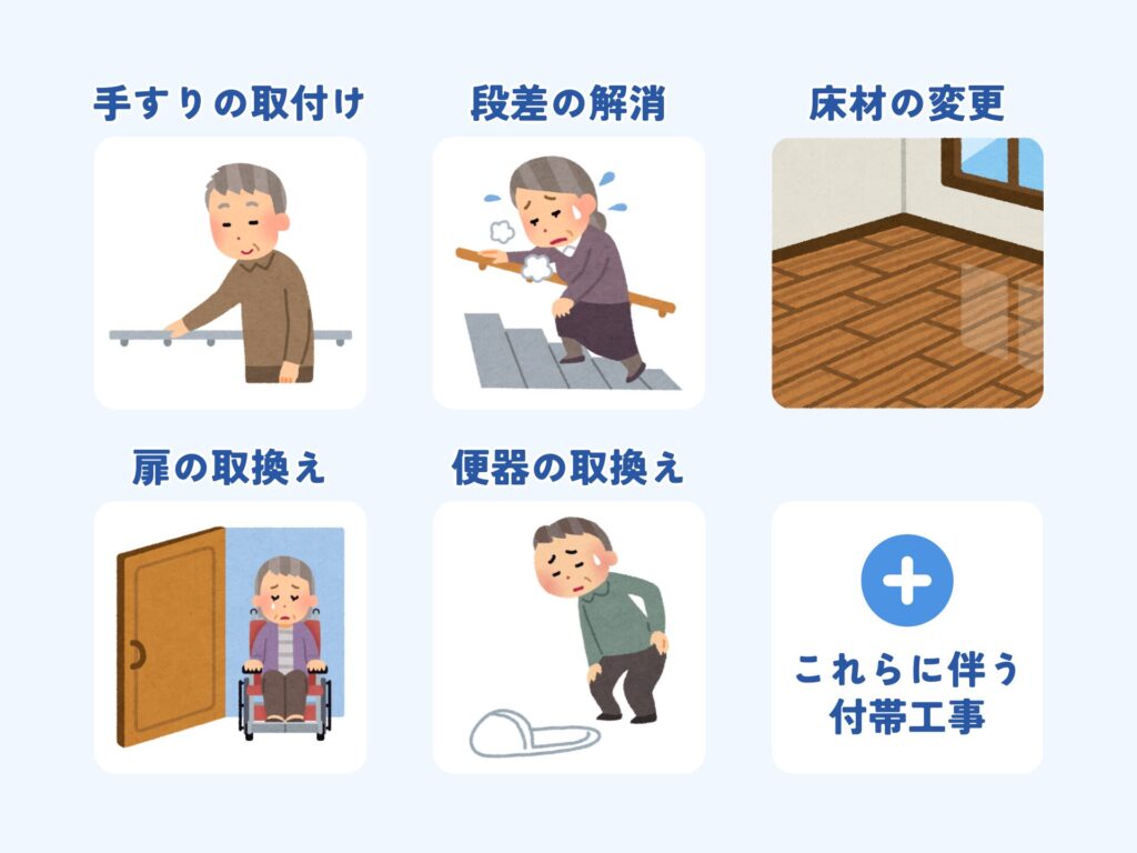 「古くなったからキレイにしたい」といったような一般的なリフォームとは違って、この制度で対象になるのは、国が定めた6種類の工事のみとなります。