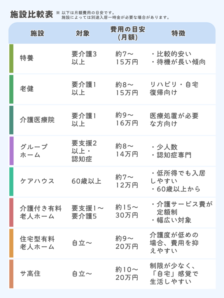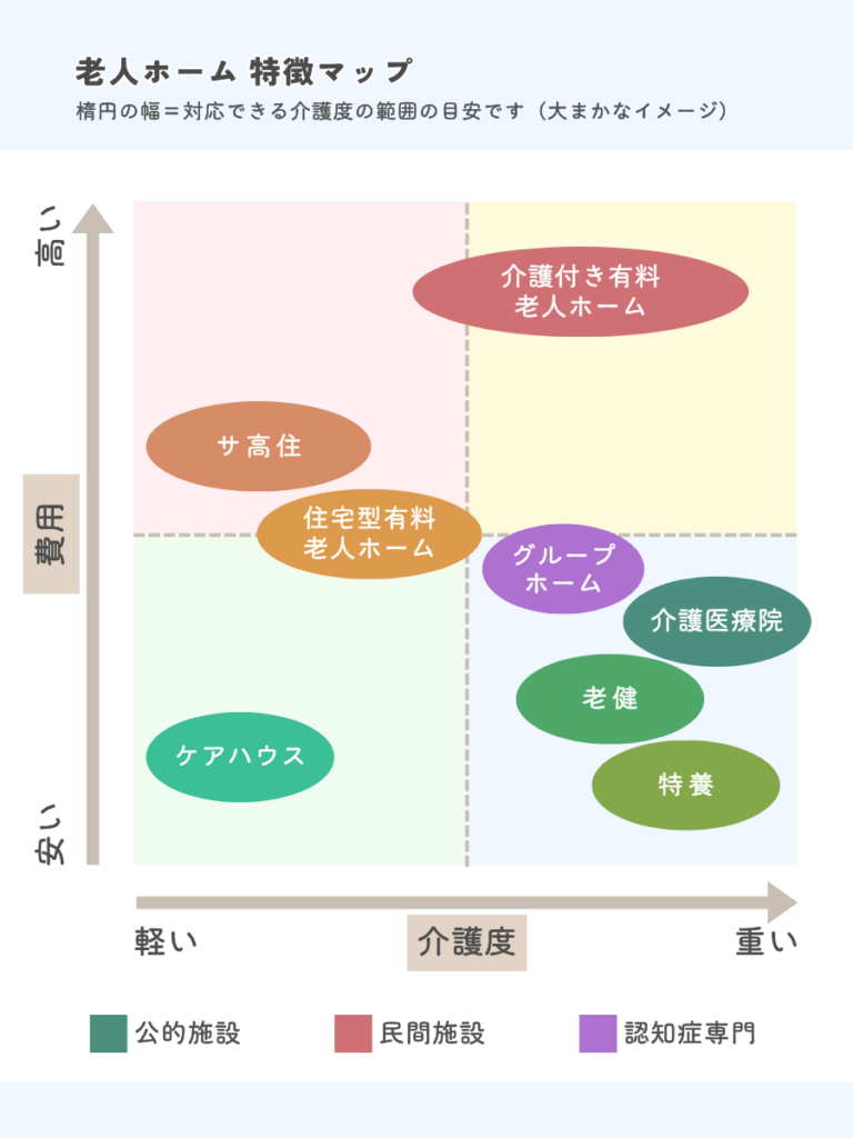 それぞれの費用や介護度の目安は、比較表や特徴マップを参考にしてみてください。