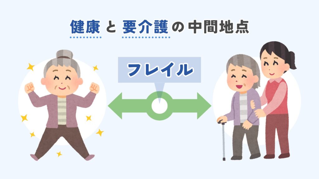 多くの場合、このフレイルの状態を経て要介護状態に進むと考えられています。つまり、「健康と要介護の中間地点」=「フレイル」というイメージです。