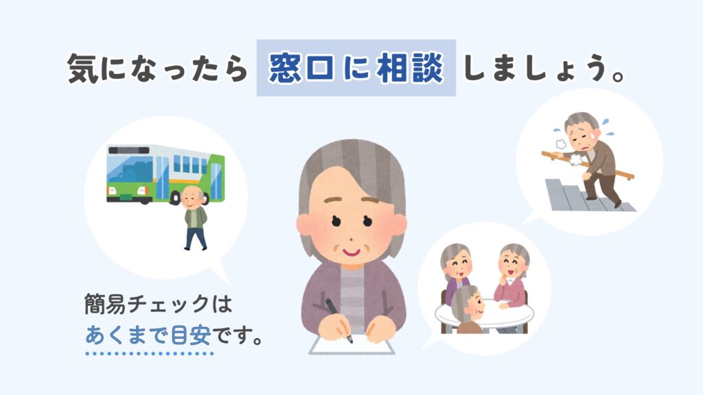 ただし、これらのセルフチェックはあくまで目安。正式な判定や、その後の対応については、地域包括支援センターや市区町村の窓口に相談するのが安心です。