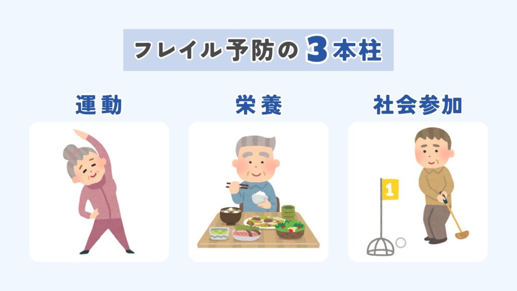 フレイルの予防は、「運動」「栄養」「社会参加」の3つが柱になります。