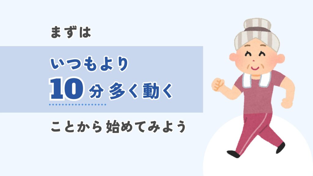 初めから完璧にこなさなくても大丈夫。まずは「いつもより10分多く動く」を目標にしてみましょう。