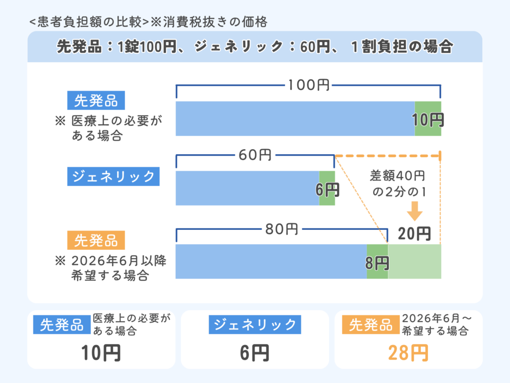 たとえば先発品が1錠100円、ジェネリックが60円の場合、差額40円の2分の1にあたる20円が追加の自己負担となります(消費税別)。